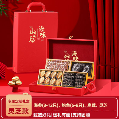 海参鲍鱼高档礼盒,四拼礼盒,海参(8-12只)、鲍鱼(6-8只)鹿茸、灵芝!甄选礼盒,送礼有面!